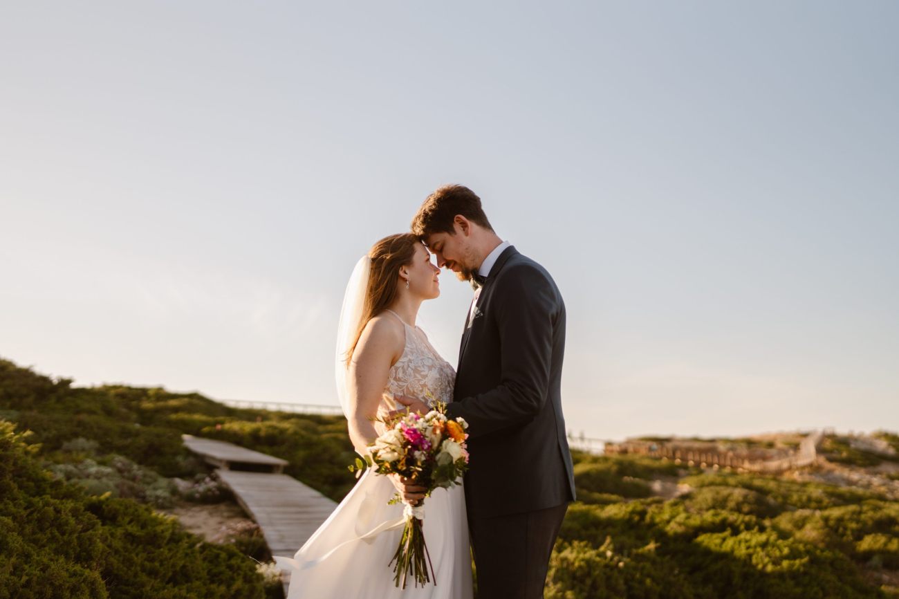 A beach elopement in Portugal offers a dreamy mix of golden sands, rugged cliffs, and the gentle sound of waves crashing along the shore. As the couple exchanges vows by the Atlantic, they're enveloped in the warm glow of the sun setting over the horizon. The unique Portuguese coastline, with its dramatic rock formations and hidden coves, creates an intimate and breathtaking atmosphere. With soft ocean breezes and the scent of salt in the air, their elopement feels timeless and serene—capturing the essence of Portugal’s natural beauty and romance.