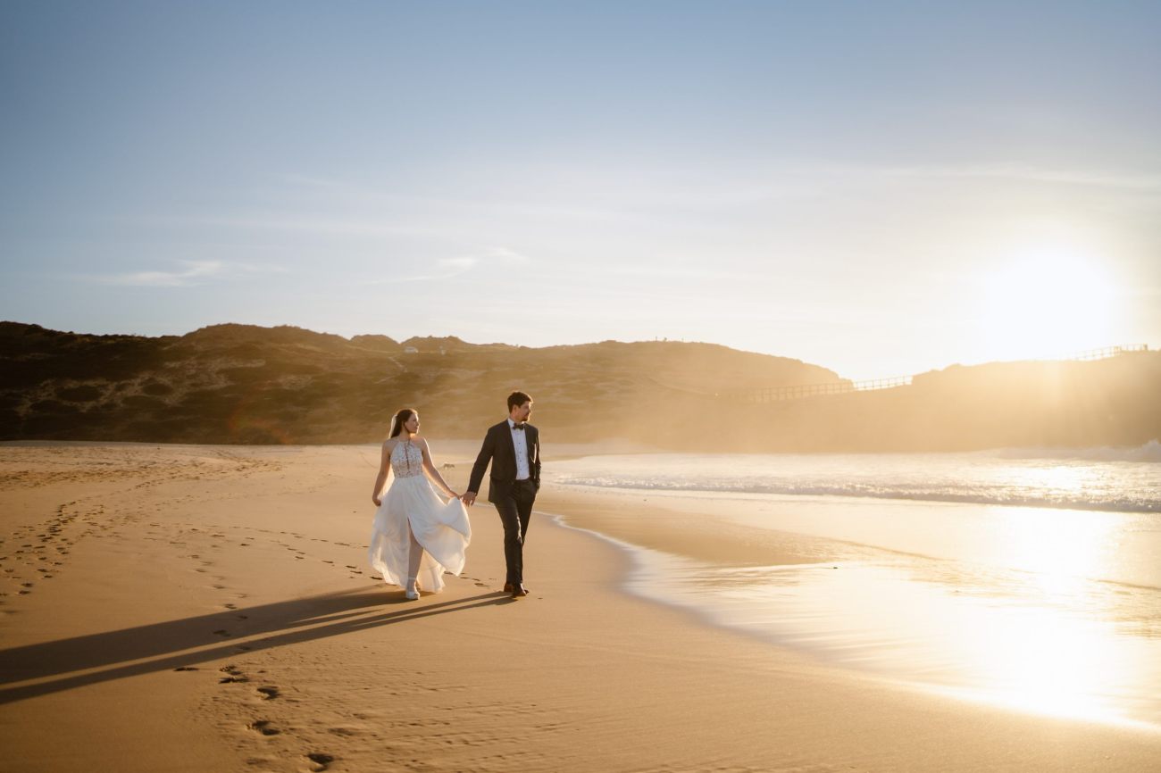 A beach elopement in Portugal offers a dreamy mix of golden sands, rugged cliffs, and the gentle sound of waves crashing along the shore. As the couple exchanges vows by the Atlantic, they're enveloped in the warm glow of the sun setting over the horizon. The unique Portuguese coastline, with its dramatic rock formations and hidden coves, creates an intimate and breathtaking atmosphere. With soft ocean breezes and the scent of salt in the air, their elopement feels timeless and serene—capturing the essence of Portugal’s natural beauty and romance.