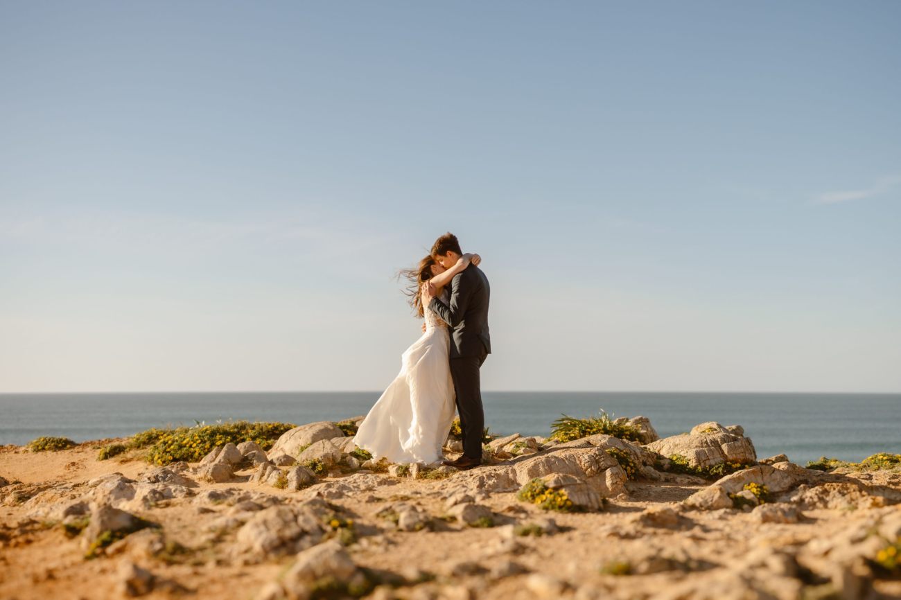 A beach elopement in Portugal offers a dreamy mix of golden sands, rugged cliffs, and the gentle sound of waves crashing along the shore. As the couple exchanges vows by the Atlantic, they're enveloped in the warm glow of the sun setting over the horizon. The unique Portuguese coastline, with its dramatic rock formations and hidden coves, creates an intimate and breathtaking atmosphere. With soft ocean breezes and the scent of salt in the air, their elopement feels timeless and serene—capturing the essence of Portugal’s natural beauty and romance.