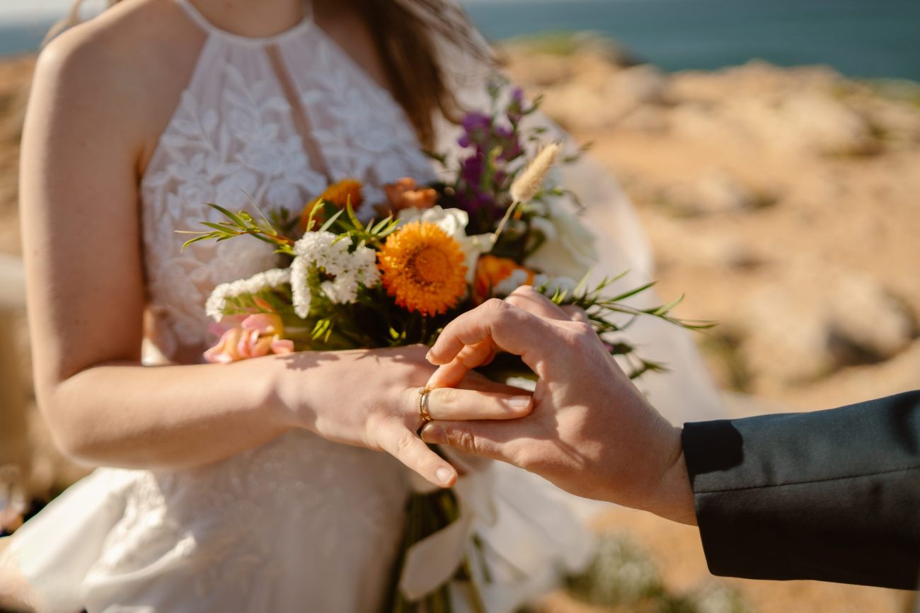 A beach elopement in Portugal offers a dreamy mix of golden sands, rugged cliffs, and the gentle sound of waves crashing along the shore. As the couple exchanges vows by the Atlantic, they're enveloped in the warm glow of the sun setting over the horizon. The unique Portuguese coastline, with its dramatic rock formations and hidden coves, creates an intimate and breathtaking atmosphere. With soft ocean breezes and the scent of salt in the air, their elopement feels timeless and serene—capturing the essence of Portugal’s natural beauty and romance.