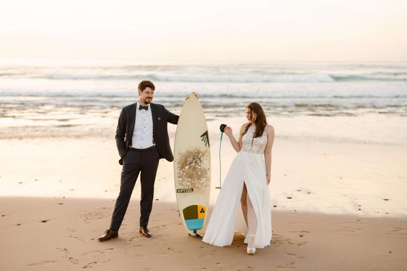 A beach elopement in Portugal offers a dreamy mix of golden sands, rugged cliffs, and the gentle sound of waves crashing along the shore. As the couple exchanges vows by the Atlantic, they're enveloped in the warm glow of the sun setting over the horizon. The unique Portuguese coastline, with its dramatic rock formations and hidden coves, creates an intimate and breathtaking atmosphere. With soft ocean breezes and the scent of salt in the air, their elopement feels timeless and serene—capturing the essence of Portugal’s natural beauty and romance.