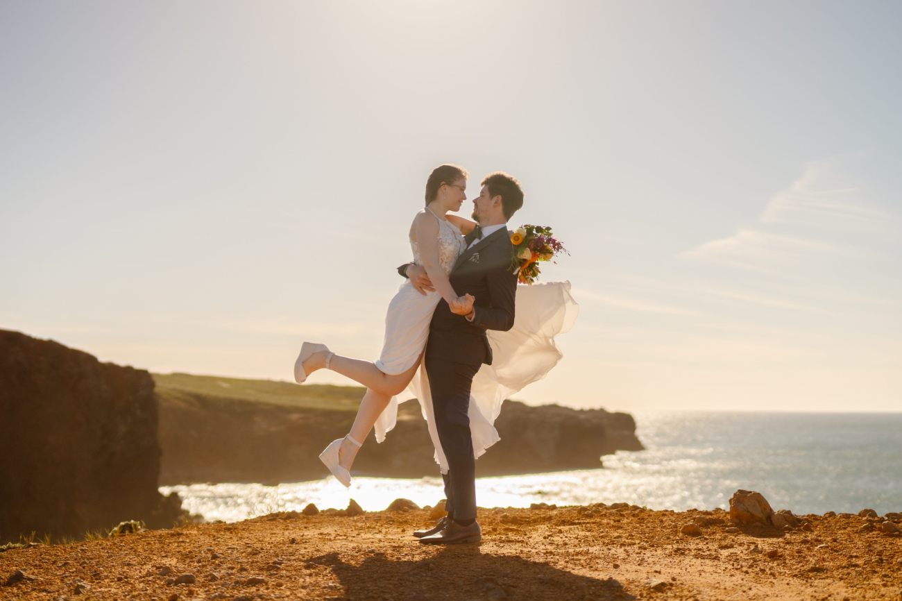 A beach elopement in Portugal offers a dreamy mix of golden sands, rugged cliffs, and the gentle sound of waves crashing along the shore. As the couple exchanges vows by the Atlantic, they're enveloped in the warm glow of the sun setting over the horizon. The unique Portuguese coastline, with its dramatic rock formations and hidden coves, creates an intimate and breathtaking atmosphere. With soft ocean breezes and the scent of salt in the air, their elopement feels timeless and serene—capturing the essence of Portugal’s natural beauty and romance.