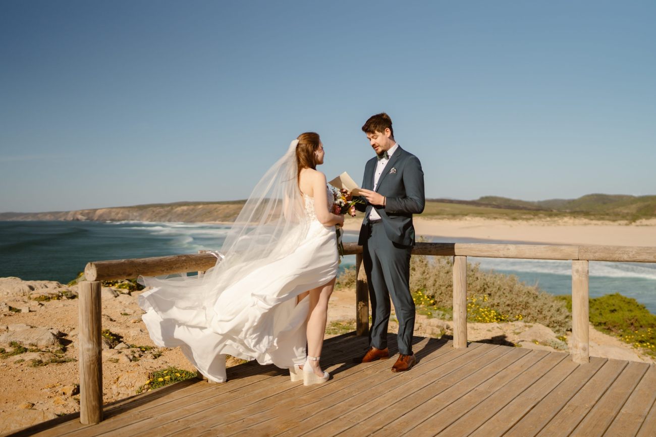 A beach elopement in Portugal offers a dreamy mix of golden sands, rugged cliffs, and the gentle sound of waves crashing along the shore. As the couple exchanges vows by the Atlantic, they're enveloped in the warm glow of the sun setting over the horizon. The unique Portuguese coastline, with its dramatic rock formations and hidden coves, creates an intimate and breathtaking atmosphere. With soft ocean breezes and the scent of salt in the air, their elopement feels timeless and serene—capturing the essence of Portugal’s natural beauty and romance.