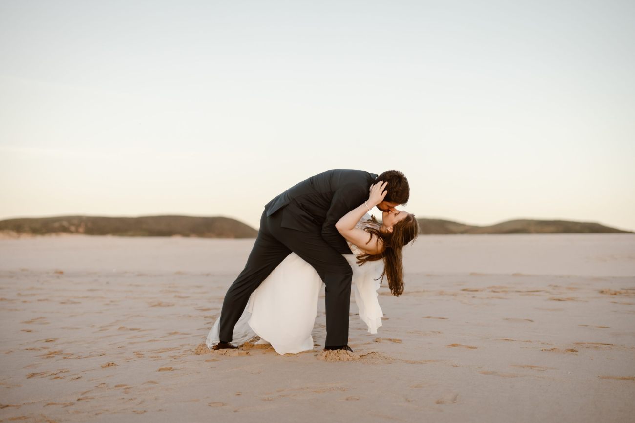 A beach elopement in Portugal offers a dreamy mix of golden sands, rugged cliffs, and the gentle sound of waves crashing along the shore. As the couple exchanges vows by the Atlantic, they're enveloped in the warm glow of the sun setting over the horizon. The unique Portuguese coastline, with its dramatic rock formations and hidden coves, creates an intimate and breathtaking atmosphere. With soft ocean breezes and the scent of salt in the air, their elopement feels timeless and serene—capturing the essence of Portugal’s natural beauty and romance.