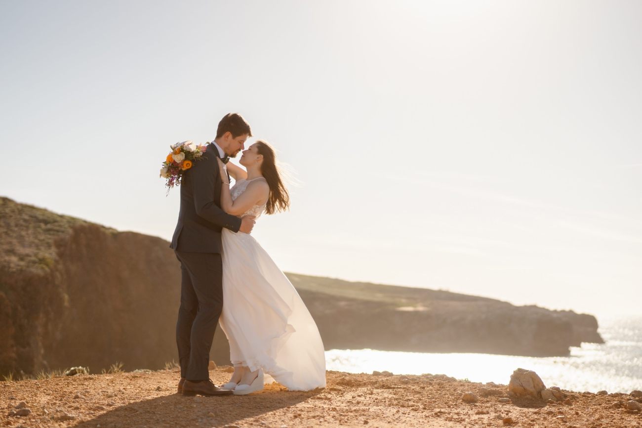 A beach elopement in Portugal offers a dreamy mix of golden sands, rugged cliffs, and the gentle sound of waves crashing along the shore. As the couple exchanges vows by the Atlantic, they're enveloped in the warm glow of the sun setting over the horizon. The unique Portuguese coastline, with its dramatic rock formations and hidden coves, creates an intimate and breathtaking atmosphere. With soft ocean breezes and the scent of salt in the air, their elopement feels timeless and serene—capturing the essence of Portugal’s natural beauty and romance.